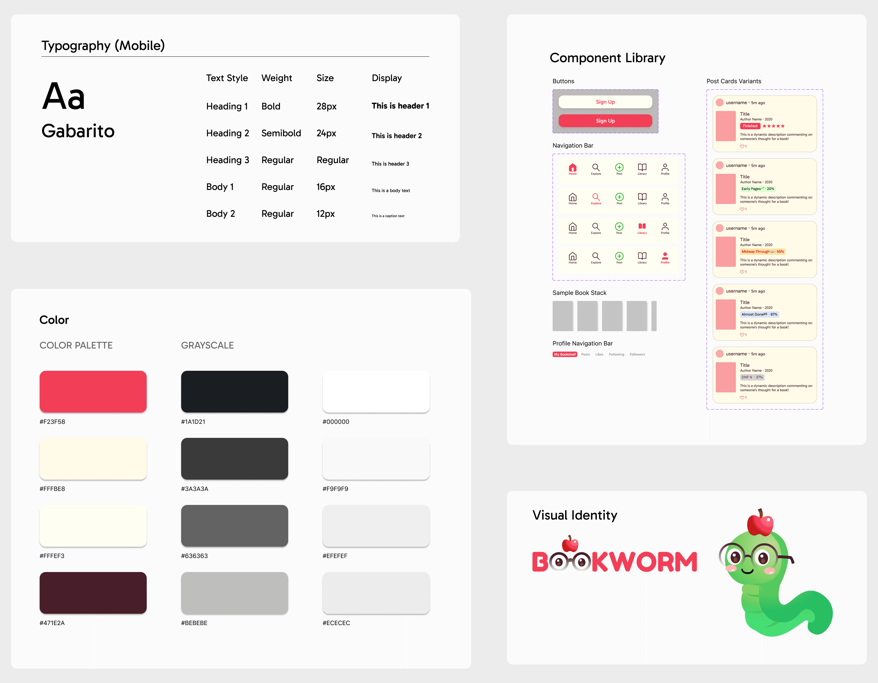 In order to get a clearer idea of HOW I would incorporate this feature-wise into the app, I sketched out low-fidelity wireframes that visualized the different screens I laid out in the information architecture. I wanted to focus on keeping the layouts familiar based on existing reading apps, while incorporating more elements of fun and personalization. The core features would be a Home page with a scrollable feed, an Explore Page that incorporates interesting reading lists, a Library Page, and a Profile that other Bookworms can visit.
